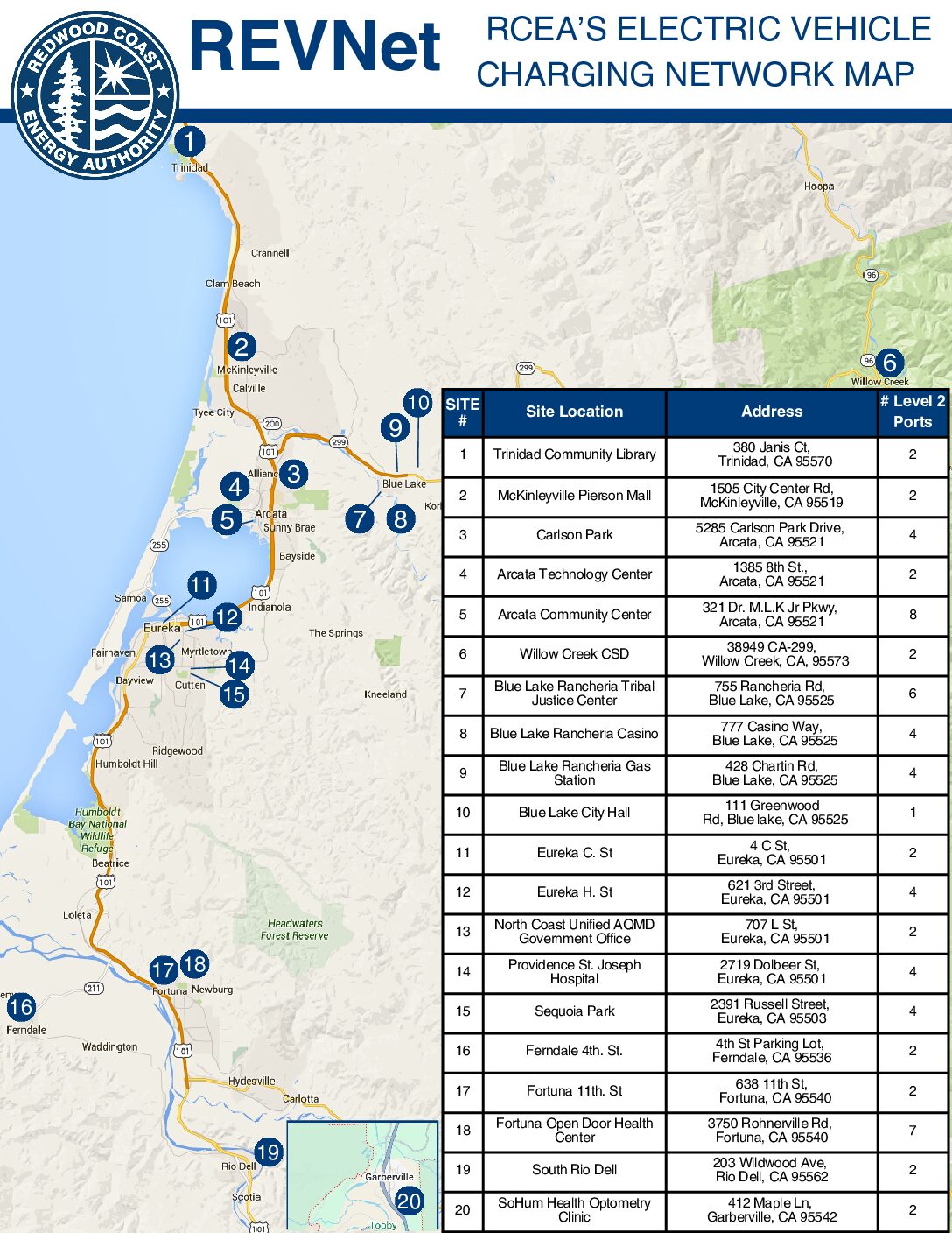 RCEA’s Rural EV Charger Network or REVNet currently has 66 ports at 34 stations in 20 locations around Humboldt County. These are the first and only publicly-owned, publicly available EV charging stations in the county!